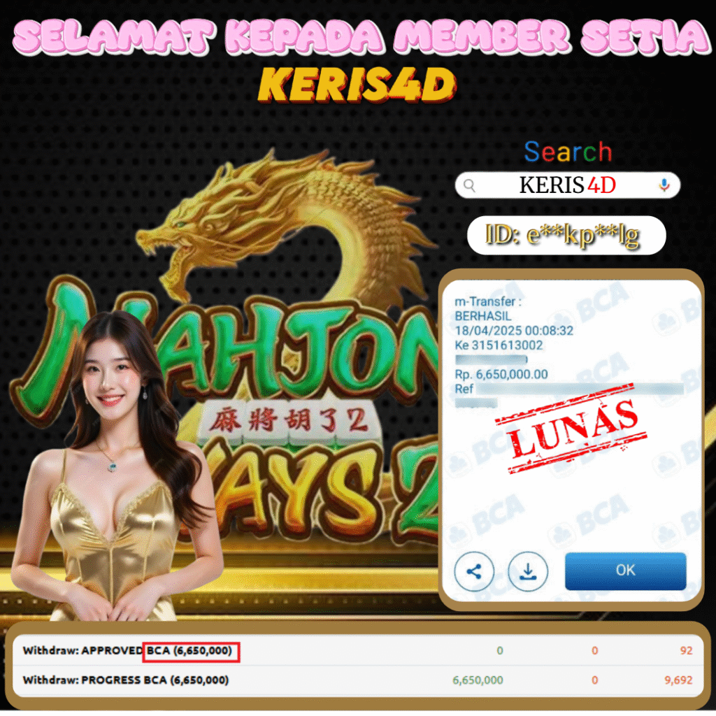 KERIS4D dikenal sebagai situs terpercaya yang selalu menghadirkan pengalaman bermain slot online yang aman, fair, dan berlisensi resmi. Di sini, kami tidak hanya sekadar memberikan janji, tapi bukti nyata berupa slip kemenangan yang dapat Anda lihat secara langsung.